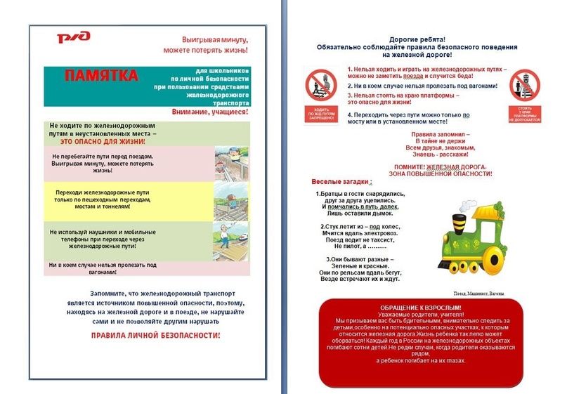 Железная дорога – удобный и востребованный вид транспорта, которым пользуются люди каждый день. Но опасностей на ней хватает, поэтому дети должны крепко-накрепко усвоить, что железная дорога – не место для игр. Нельзя кататься по платформе на велосипеде, скейтборде, роликах – ЭТО ОПАСНО ДЛЯ ЖИЗНИ! Нужно опасаться края платформы, нельзя стоять на линии, обозначающей опасность! Оступившись, можно упасть на рельсы под приближающийся поезд. Взрослые обязаны помнить: дети на вокзале должны находиться под наблюдением, маленьких детей следует держать за руки.